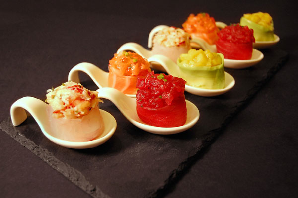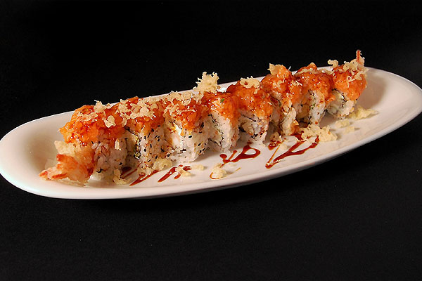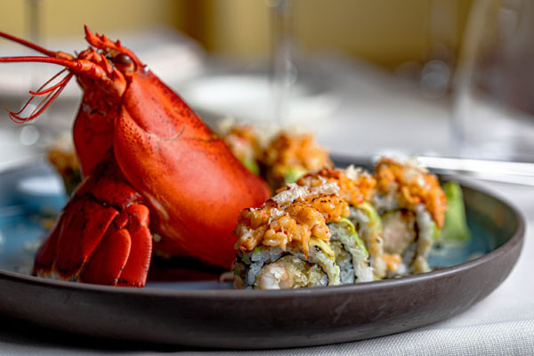 Tempura di gambero* con avocado, ricoperto con astice tritato in flambè.
